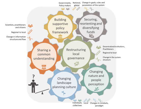 Our findings reveal that NbS scaling requires coordinated progress across multiple interconnected leverage points. These include establishing supportive policies and targeted funding; enhancing the production and sharing of knowledge about NbS; reforming local governance to strengthen collaboration; promoting a landscape planning culture that fully integrates nature; and encouraging shifts in societal values and perceptions of nature.